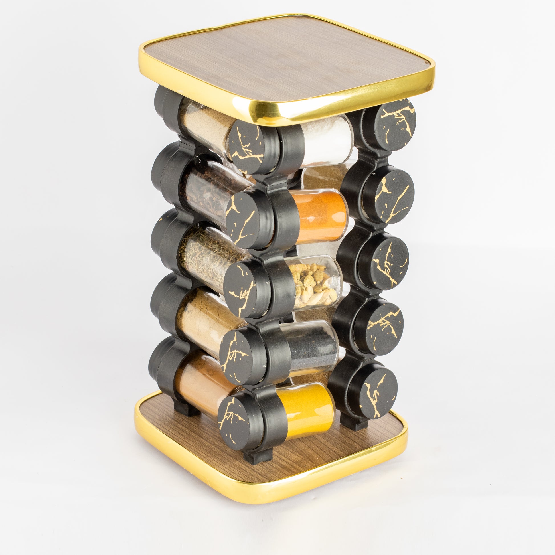 هذا الحامل المربع الدوار الأنيق متوفر في ١٢ أو ١٦ أو ٢٠ برطمانًا أكريليكيًا فاخرًا، كل منها مزود بأغطية بلاستيكية ذهبية محكمة الإغلاق ، مما يحافظ على نضارة توابلك وسهولة الوصول إليها. مقبض ذهبي متين من الفولاذ المقاوم للصدأ يجعله عمليًا وجميلًا في آن واحد.