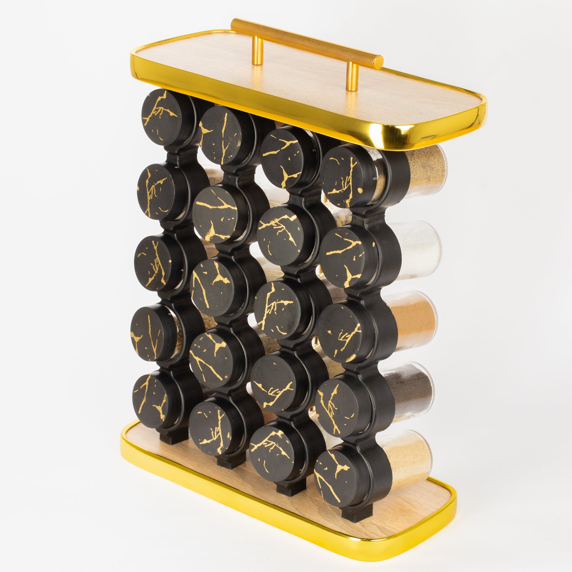 حامل التوابل المستطيل الأنيق هذا متوفر في ١٢ أو ١٦ أو ٢٠ برطمانًا أكريليكيًا فاخرًا، كل منها مزود بأغطية بلاستيكية ذهبية محكمة الإغلاق ، مما يحافظ على توابلك طازجة ومعروضة بشكل جميل. يضفي المقبض الذهبي الأنيق لمسة ديكور عصرية، تجمع بين العملية والأناقة.
