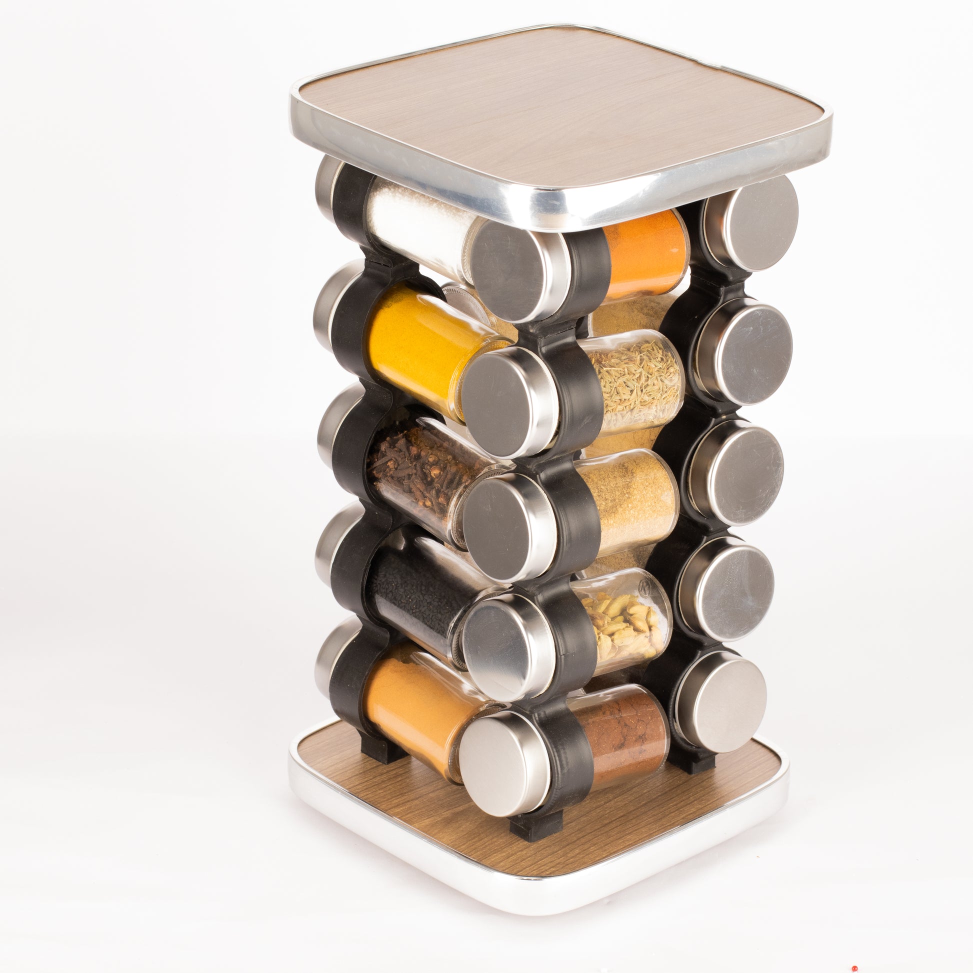 هذا الحامل المربع الدوار الأنيق متوفر في ١٢ أو ١٦ أو ٢٠ برطمانًا أكريليكيًا فاخرًا، كل منها مزود بأغطية فضية محكمة الإغلاق من الفولاذ المقاوم للصدأ ، مما يحافظ على توابلك طازجة ويسهل الوصول إليها. مقبض وطبقة نهائية فضية متينة من الفولاذ المقاوم للصدأ تجعله عمليًا وجميلًا في آن واحد.