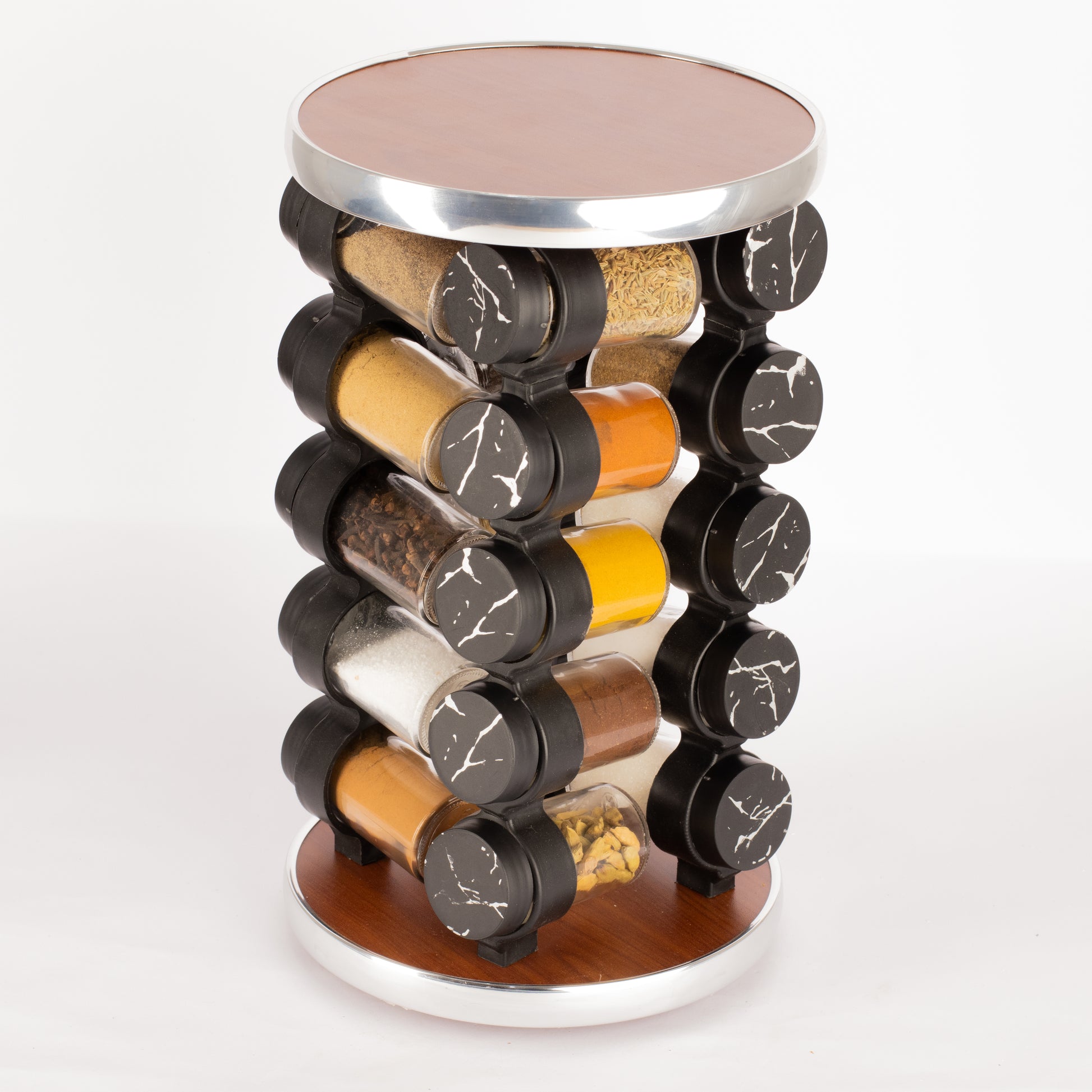 حامل القرص الدوار الأنيق هذا متوفر في عبوات أكريليك فاخرة سعة ١٢ أو ١٦ أو ٢٠ برطمانًا، كل منها مزود بأغطية بلاستيكية فضية محكمة الإغلاق ، مما يحافظ على نضارة توابلك وسهولة الوصول إليها. مقبض وطبقة نهائية فضية متينة من الفولاذ المقاوم للصدأ تجعله عمليًا وجميلًا في آن واحد.